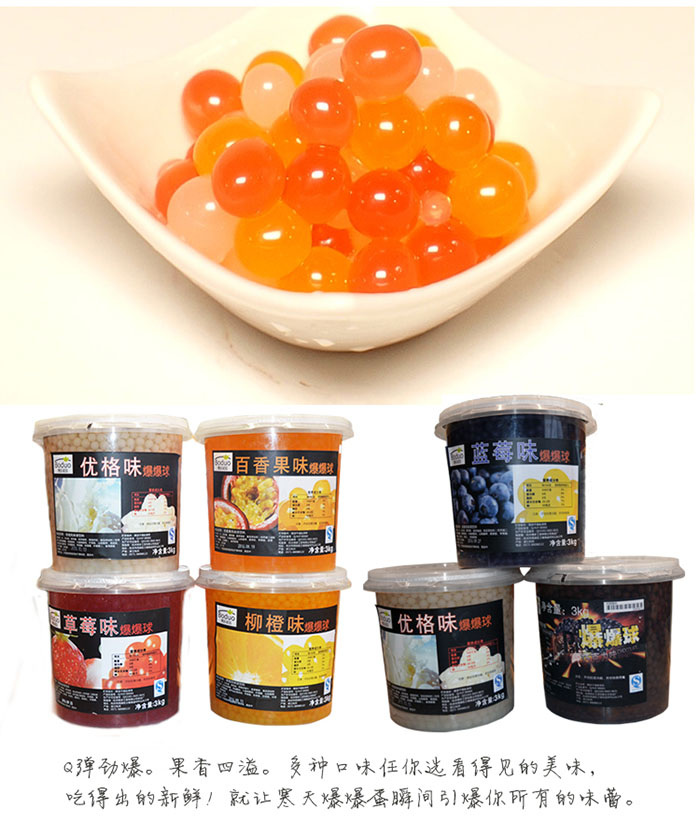 魔力豆(爆爆珠): 外覆海藻膠薄膜,內(nèi)包果汁;經(jīng)低溫殺菌,可常溫保存一年,使用方便。(開(kāi)啟后須冷藏)。柳橙爆爆蛋以新鮮柳橙為原料經(jīng)過(guò)調(diào)配、殺菌、灌裝等工序生產(chǎn)的果汁飲料產(chǎn)品。